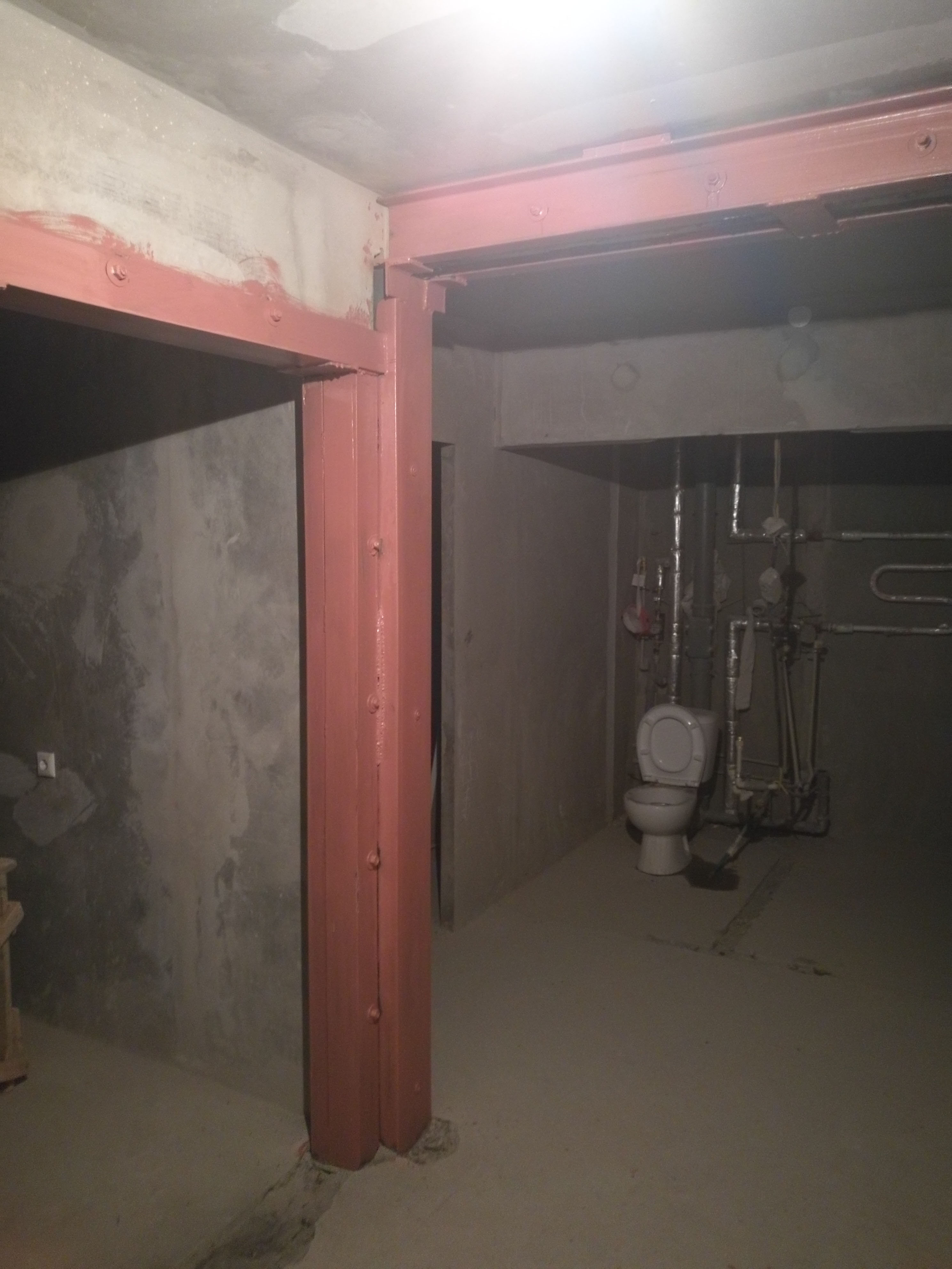 С помощью алмазной резки и дробления, произвели демонтаж бетонной стены 160 мм и установлено усиление уголками и швеллерами с двух сторон.