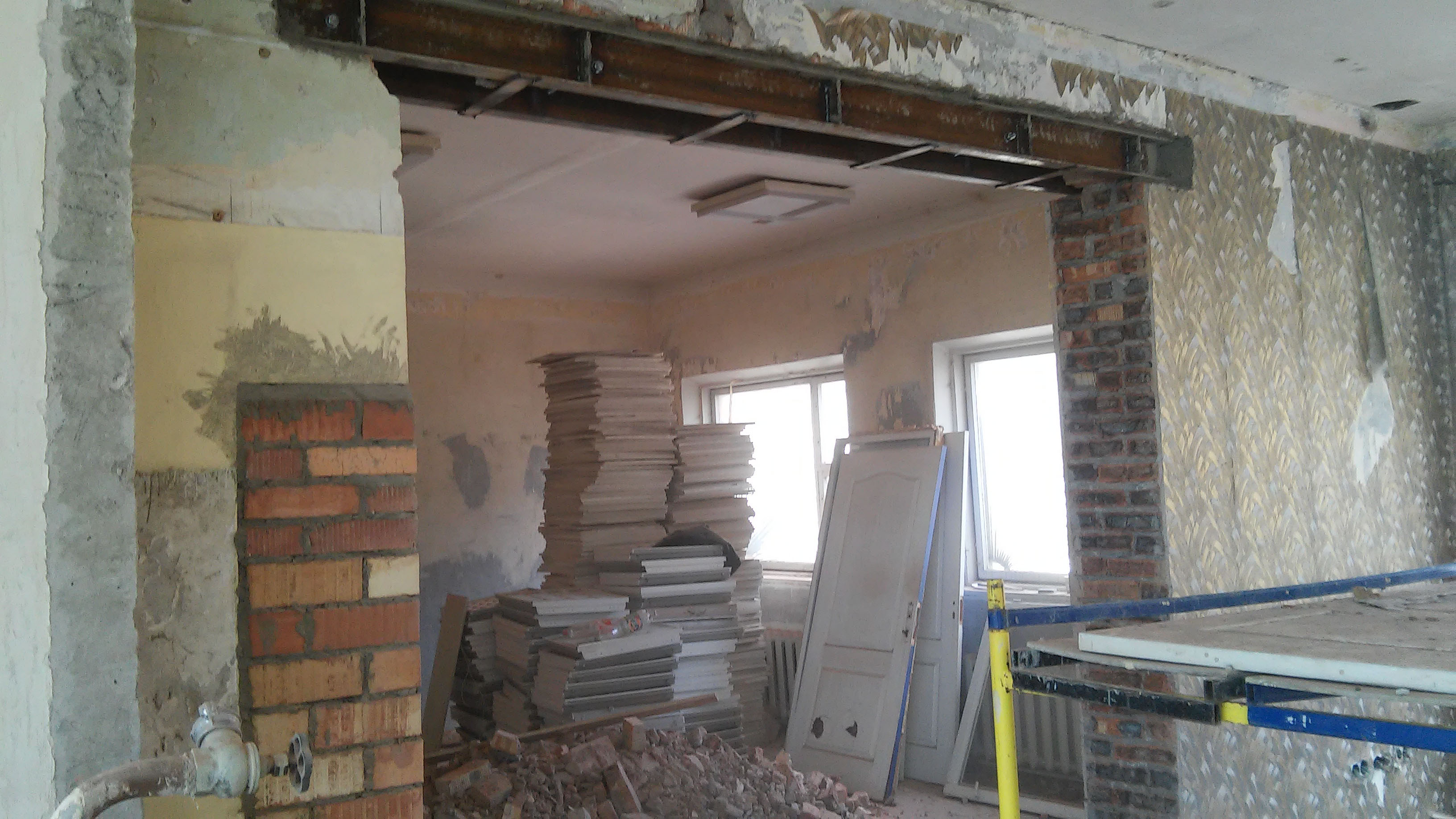 Был осуществлён демонтаж и вырезка проёмов в стенах с последующим усилением уголками, согласно проекту, со всеми документами.