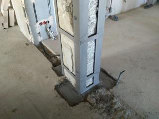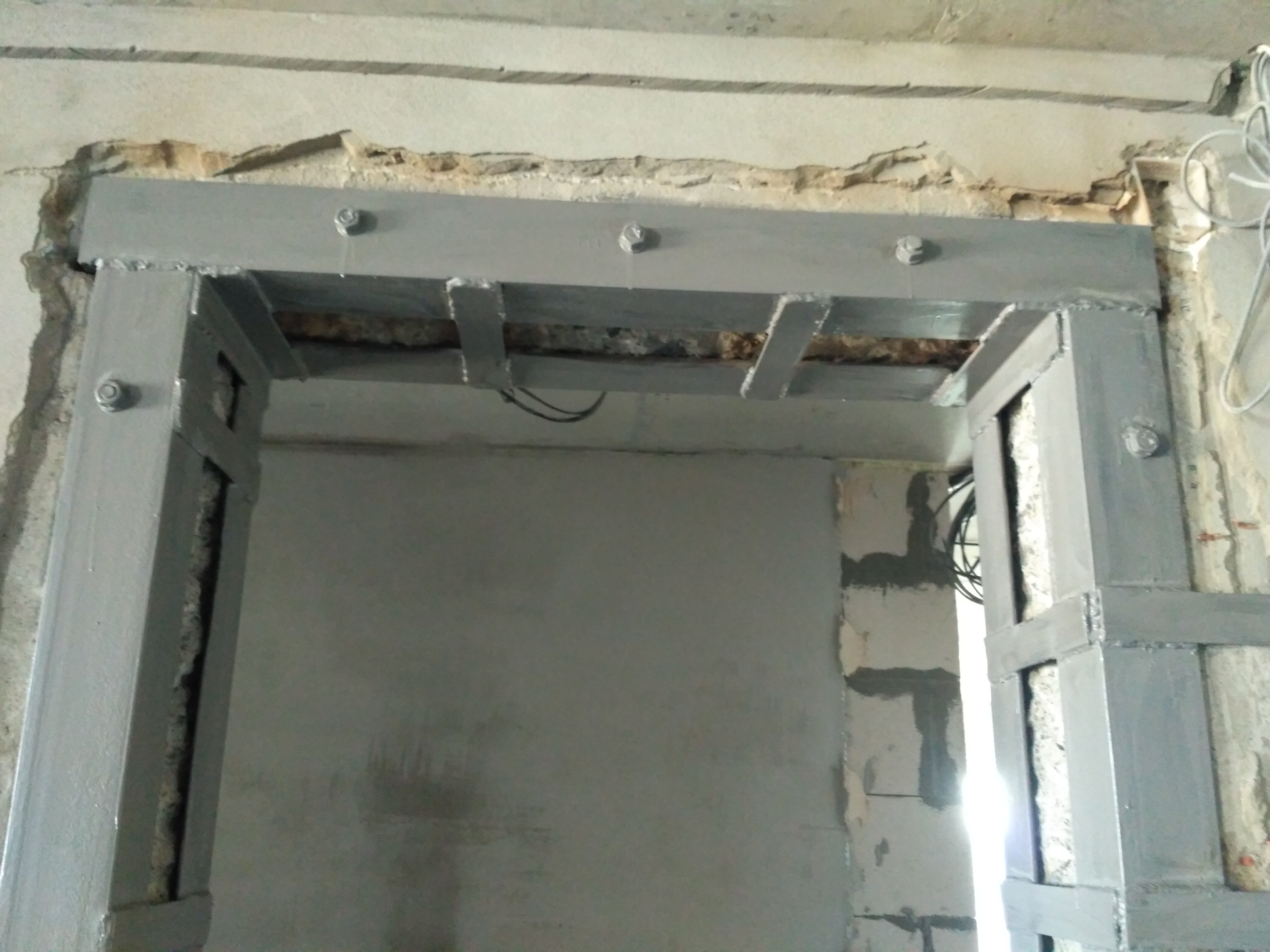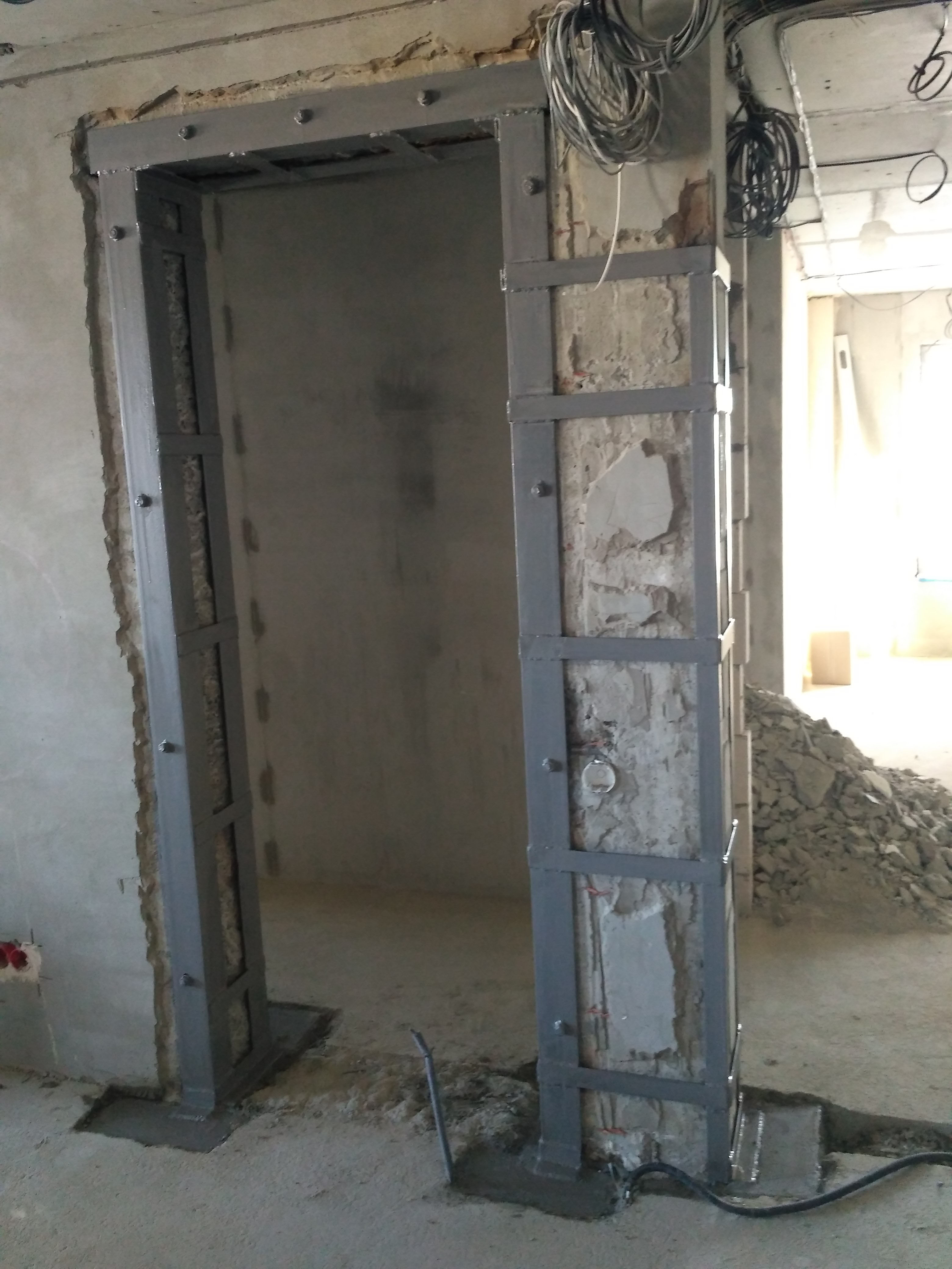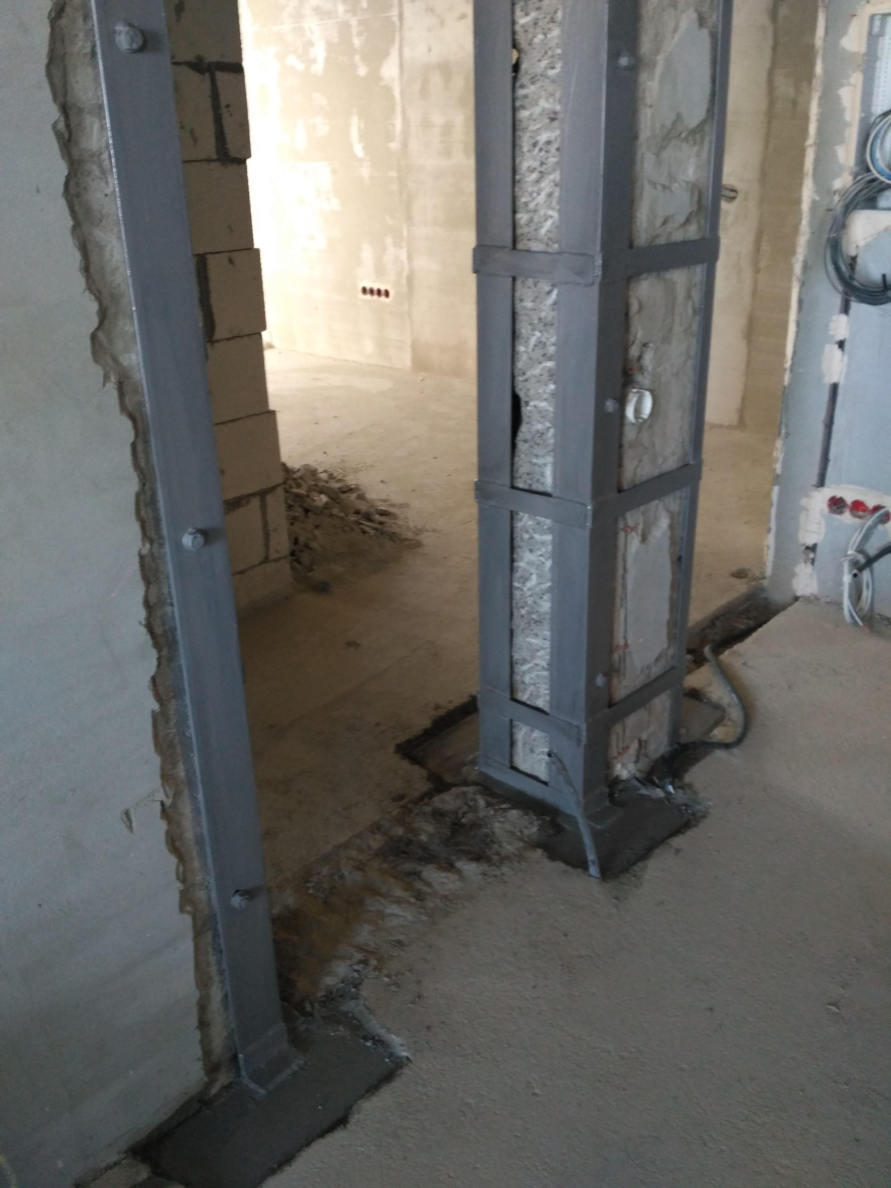 С использованием алмазного инструмента были вырезаны проёмы в несущих стенах и произведено их усиление швеллерами и уголками по проекту.