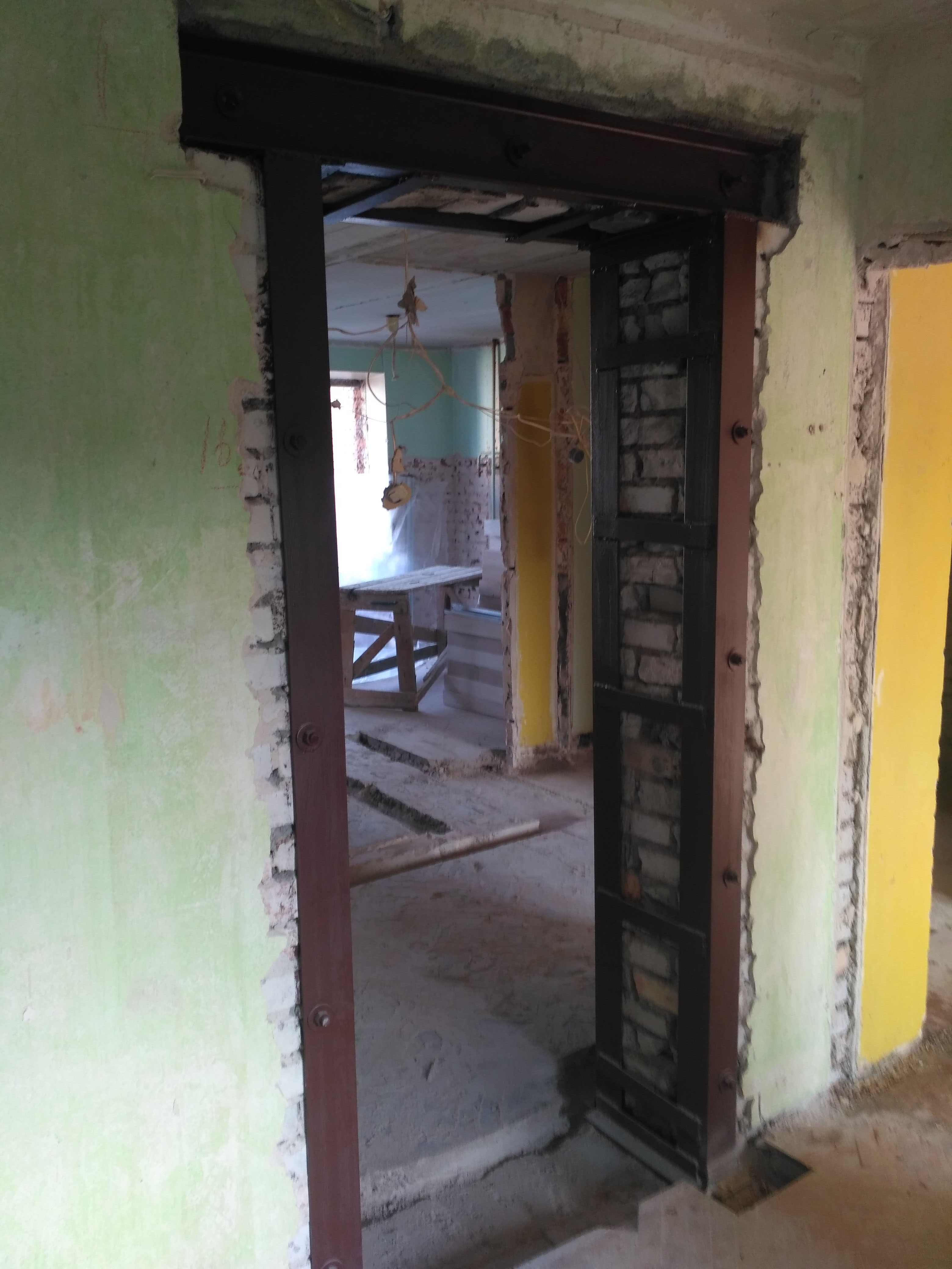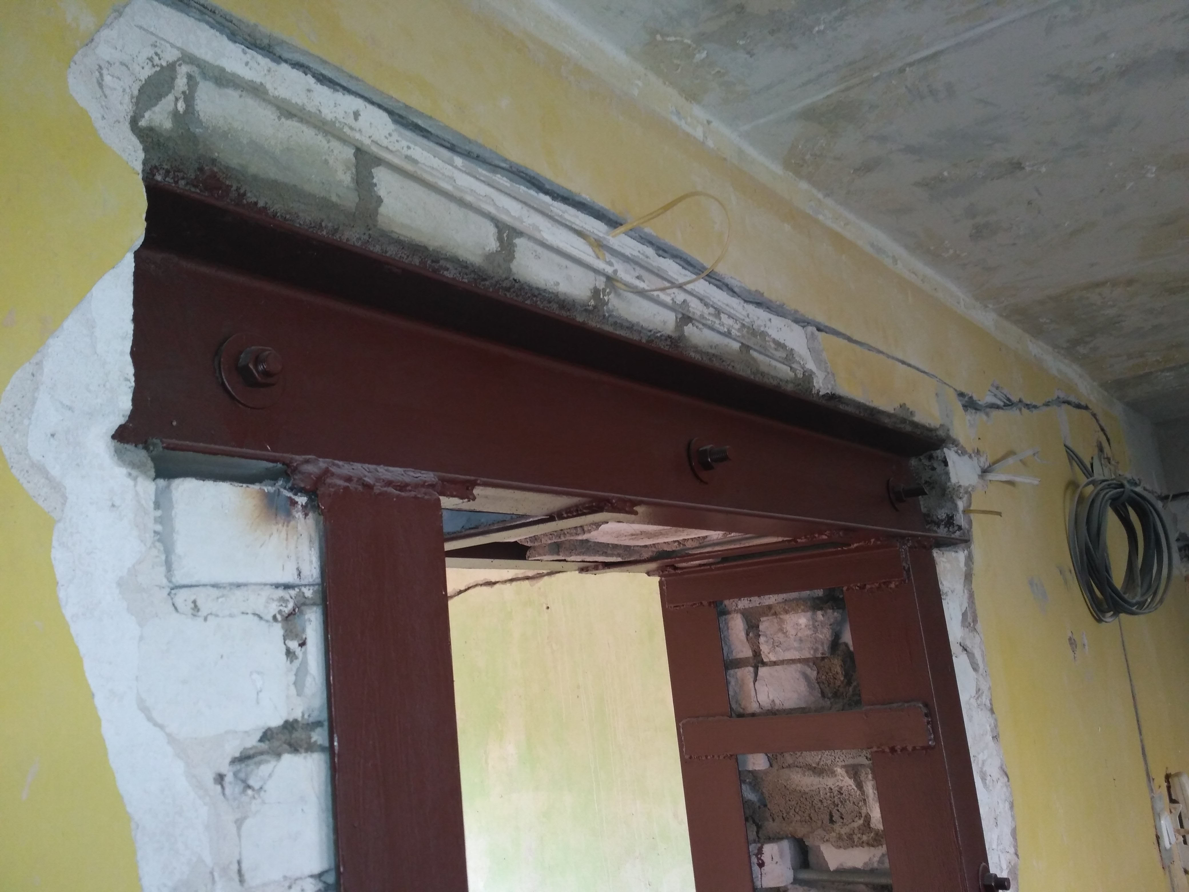 Установлена несущая перемычка из швеллера с двух сторон, демонтирована кирпичная стена и усилена уголками, произведён вывоз мусора.