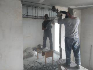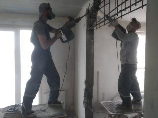 Была осуществлёна алмазная резка, используя диск глубиной пропила 13 см, с последующим демонтажём несущей стены и усилением швеллером в виде короба,вывезен строительный мусор.