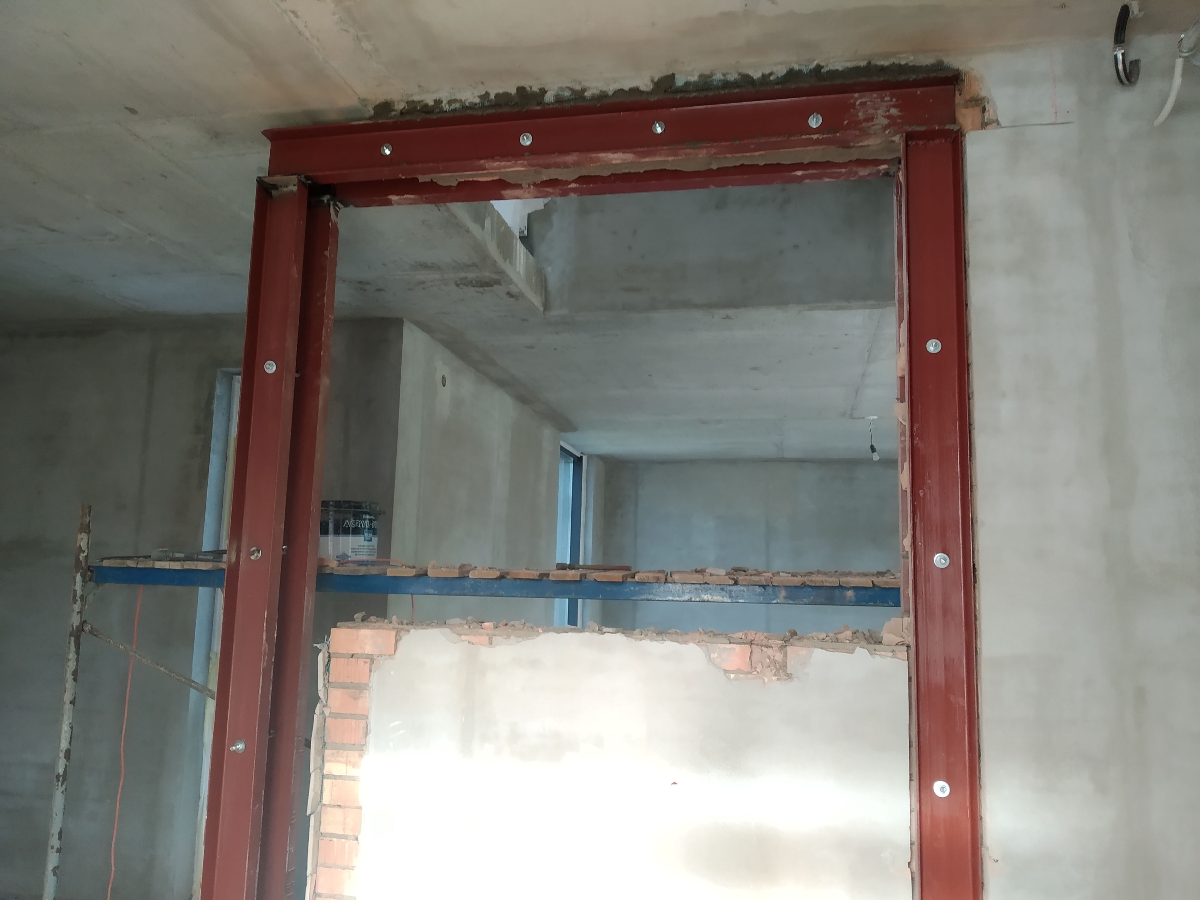 Было выполнено штробление и смонтированы горизонтальные опорные швеллера с двух сторон в стене из кирпича, установили вертикальные швеллера в штробы и стянули их шпильками, которые образовали несущую конструкцию в виде буквы П.