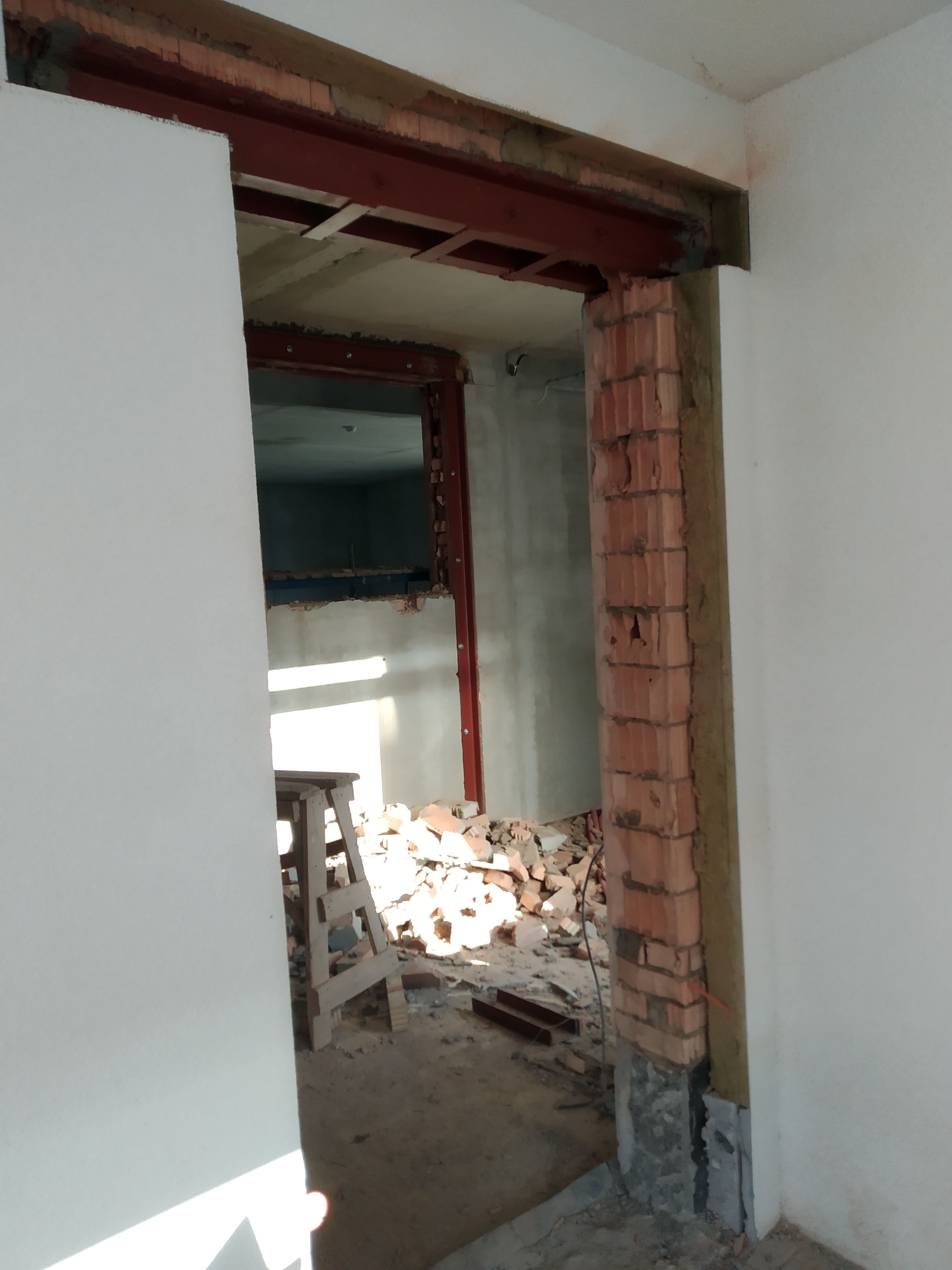 Было выполнено штробление и установлены опорные швеллера с двух сторон в стене, которые взяли на себя функцию несущей перемычки.