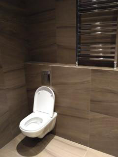 Бетонный потолок покрашен акриловым лаком, в санузле уложена плитка керамогранит и установлена новая сантехника.
