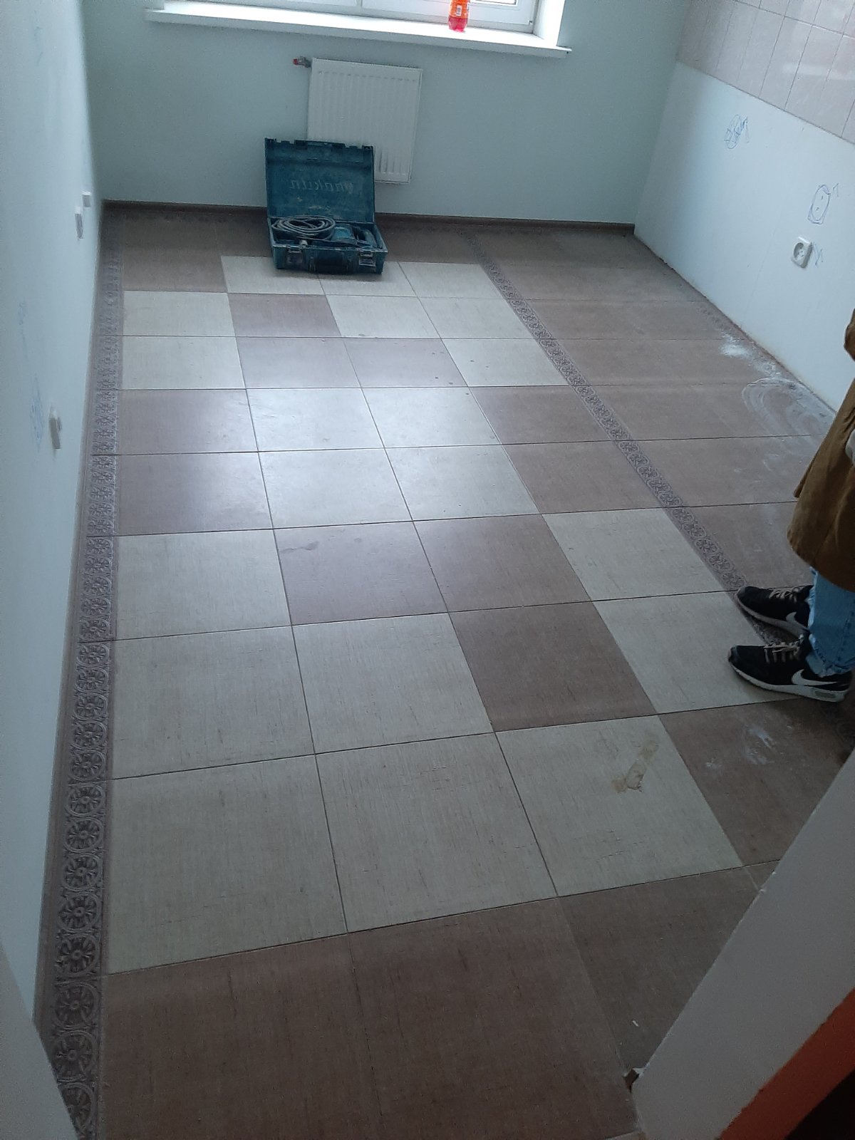 Сбить старую плитку и клей на полу. Вывезти мусор.